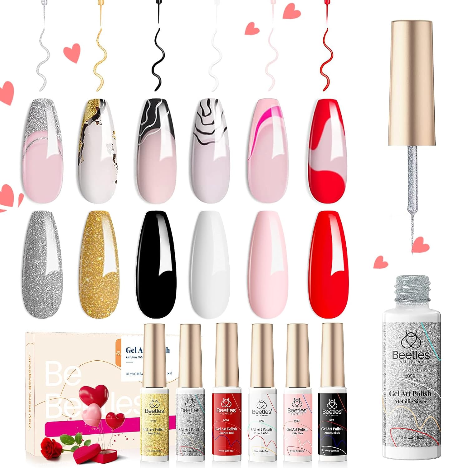 Beetles Gel Polish 6 Pcs Black White Red Gold Silver Glitters Colors Paint Swirl Built Thin Brush in Bottle Soak off Uv Led Lamp Valentine Nail Polish