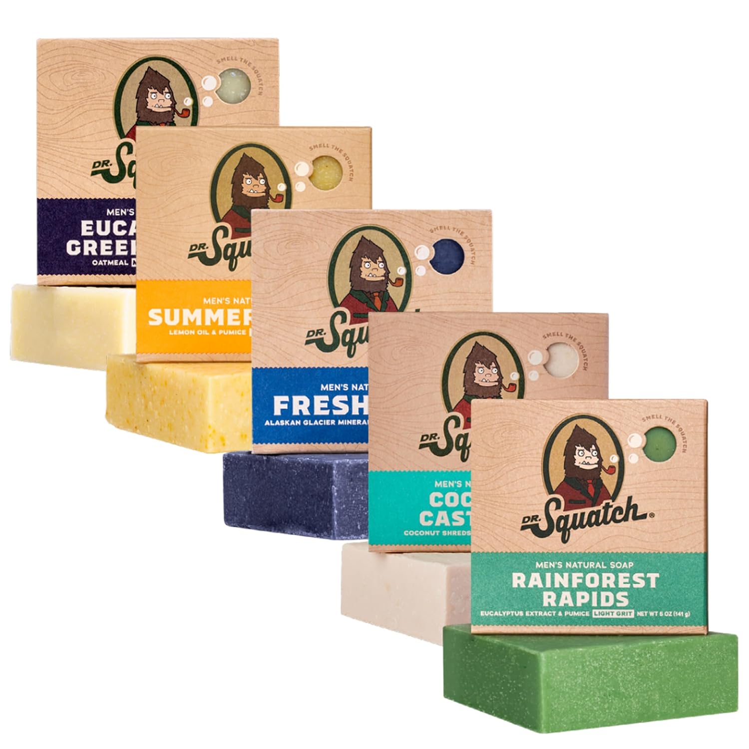 Dr. Squatch All Natural Bar Soap for Men, 5 Bar Variety Pack - Men's Natural Bar Soap - Rainforest Rapids, Coconut Castaway, Fresh Falls, Summer Citrus, and Eucalyptus Greek Yogurt - Soap Gift