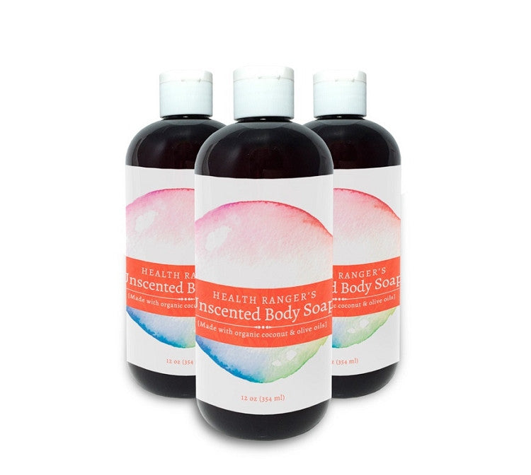 Health Ranger's Unscented Body Soap is made with the finest organic coconut and olive oils and is free of harsh chemicals. This premium liquid soap has a luxurious texture that washes away dirt and rinses clean, leaving your whole body feeling rejuvenated. This unscented formula is ideal for those who are chemically sensitive or prefer zero fragrance. 100% China-free, non-GMO and non-synthetic. Contains no irradiated or genetically modified ingredients.
