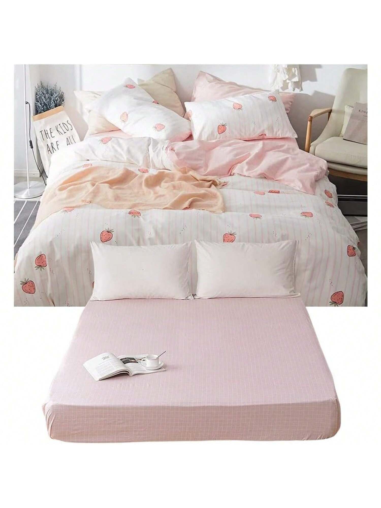 Homehours 4 PCS Kawaii Strawberry Duvet Cover Set1 Duvet Cover + 2 Standard Pillowcases + 1 Fitted Sheet