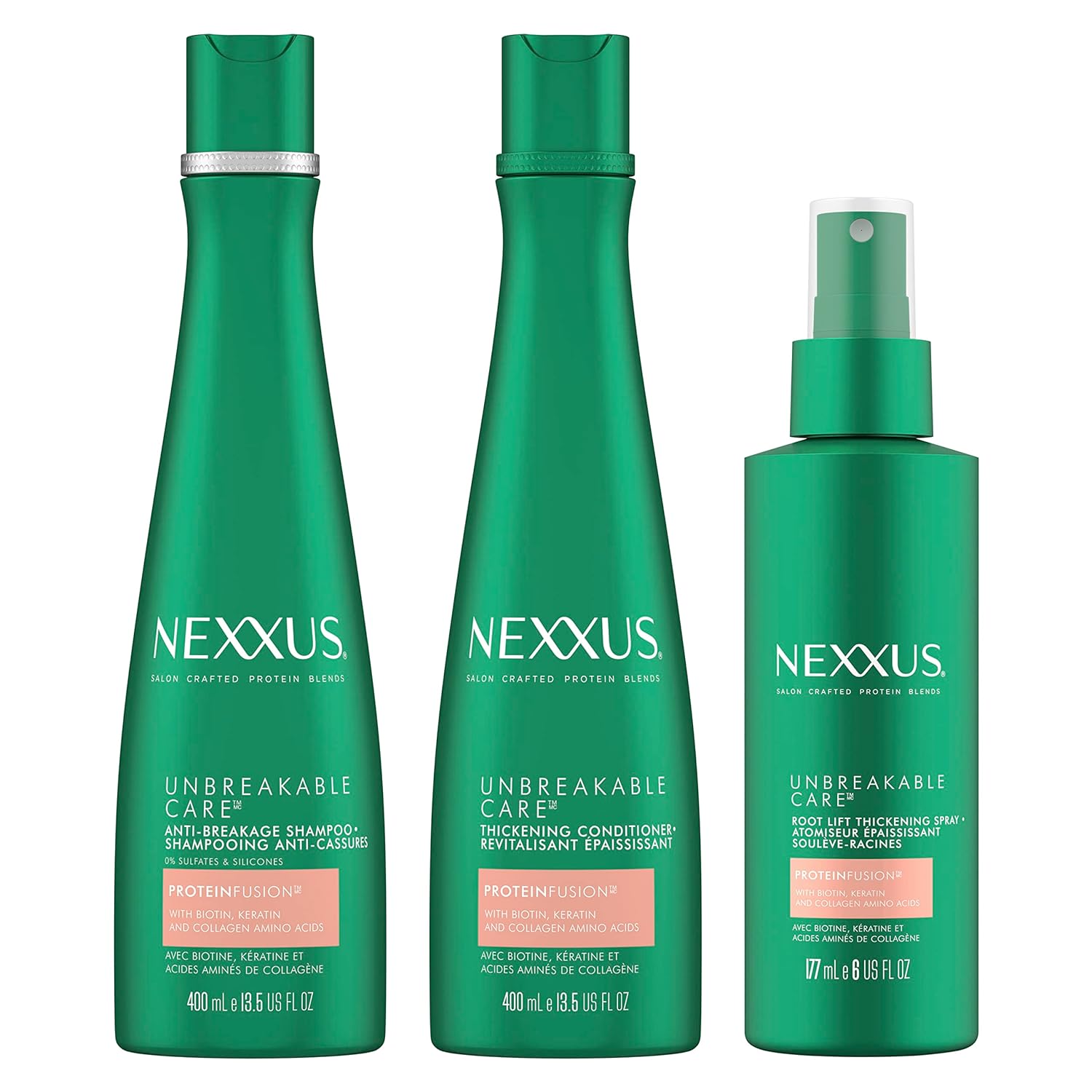 Nexxus Unbreakable Care Shampoo, Conditioner, and Leave-In Spray 3 Pack For Fine and Thin Hair with Keratin, Collagen, Biotin