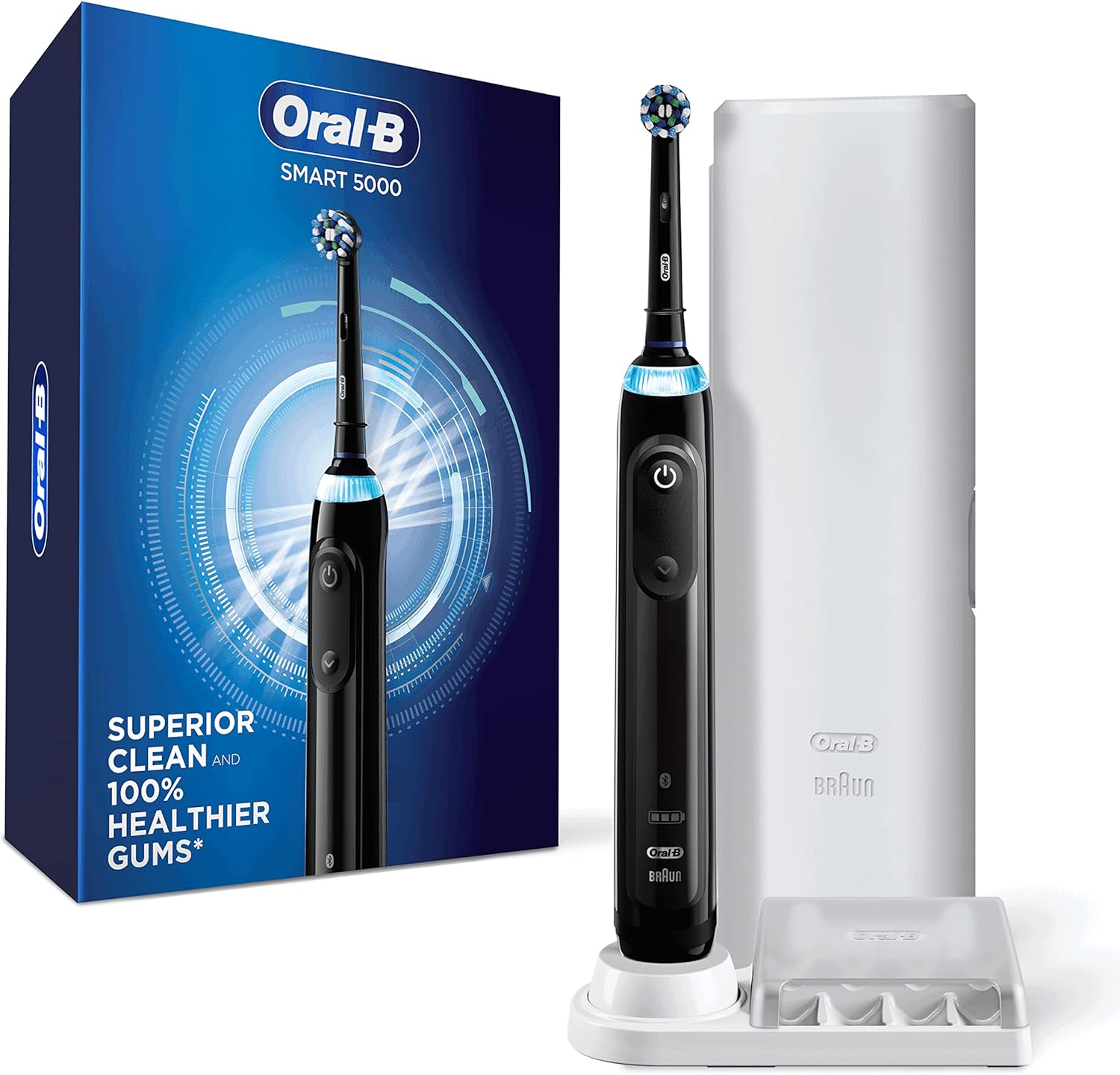 The Oral-B SMART 5000 Power Rechargeable Electric Toothbrush with Bluetooth Connectivity features a CrossAction brush head with bristles that reach deep between teeth for healthier gums.* Bluetooth communication allows the brush to connect with your smartphone to give you real-time feedback on your brushing habits and create a dental care journey based on your oral health goals. The Visible Pressure Sensor on the brush lights up to tell you when you apply too much pressure to your teeth and gums to help prevent harmful over-brushing. The toothbrush features 5 cleaning modes and a timer to help you brush for a dentist recommended 2 minutes. Oral-B SMART 5000 is compatible with a variety of replacement toothbrush heads and includes a convenient travel toothbrush holder. *vs a regular manual toothbrush Trust in the precision engineering of Braun and the dental expertise of Oral-B, the #1 brand used and recommended by dentists worldwide. 100% Satisfaction Guaranteed. Manufacturer Contact Information Customer support : (800) 566-7252 or (800) 566-ORALB